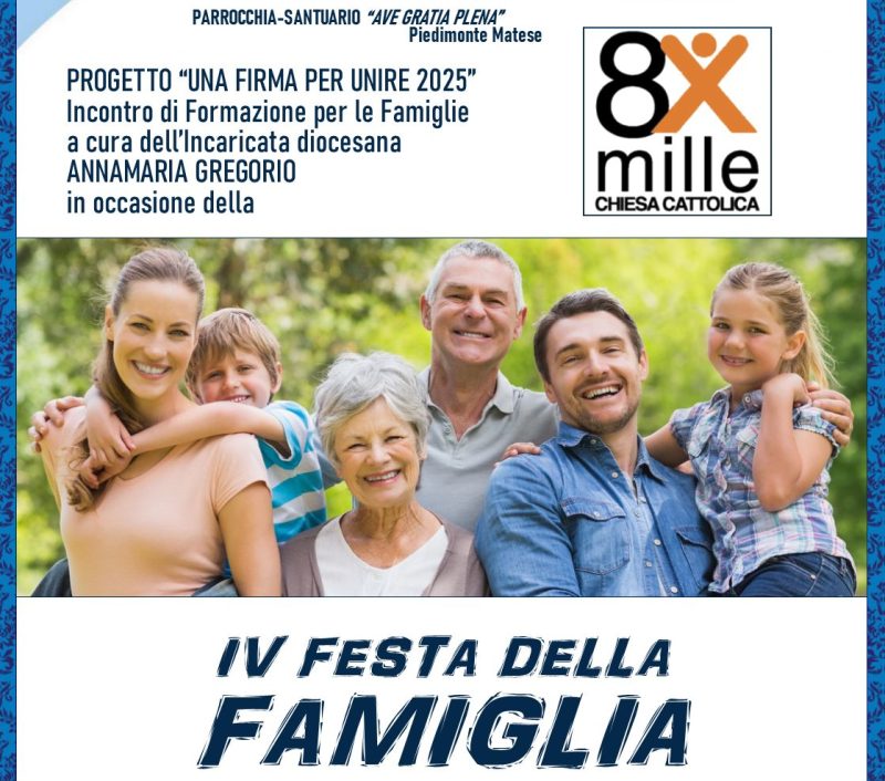 Il progetto “Una firma per unire” è stato pubblicizzato e avviato in numerose parrocchie della diocesi. Quella di Ave Gratia Plena, come di consueto ogni anno realizza un incontro con la sua comunità, nel mese di settembre. Infatti una manifestazione gioiosa, che ha pienamente espresso i valori di comunione, corresponsabilità e compartecipazione, è stata quella realizzata il 4 settembre sera, presso l’Oratorio San Filippo Neri, nella Parrocchia Ave Gratia Plena di Piedimonte Matese, dove il Parroco Don Armando Visone, insediatosi nel 2022, ha fortemente voluto ogni anno una “Festa della Famiglia”, che ha raggiunto la IV edizione, organizzata dalla Confraternita di Santa Maria della Libera, con la collaborazione del Gruppo “Famiglie in cammino”, dei Gruppi parrocchiali e dell’Amministrazione Comunale, come sempre prevista durante il periodo del novenario dedicato a Maria Santissima della Libera, (30 agosto – 7 settembre).